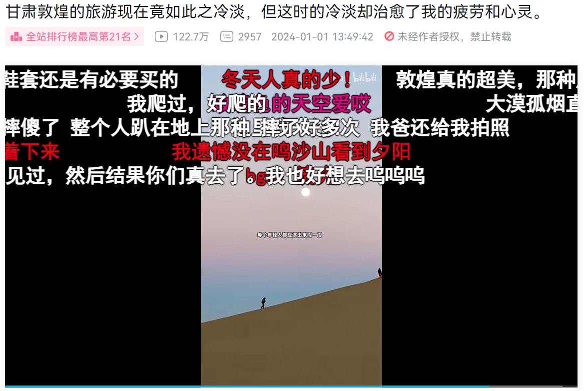 以敦煌为例,旅游资源得天独厚的敦煌旺季在每年5月至10月,冬春季节因气候原因为淡季。但2024年1月1日视频博主“B太”发布了一条淡季游敦煌的视频,在B站收获了120万播放量,小红书有6.7万点赞量,让淡季的敦煌也“热”了起来。