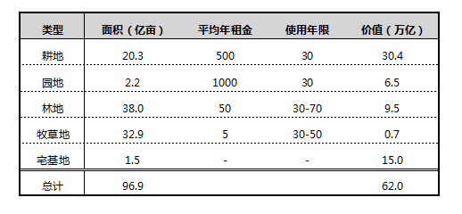 我国农业用地96.8亿亩,其中耕地20.27亿亩、园地2.16亿亩、林地37.96亿亩、牧草地32.9亿亩。流转之后,这些土地的价值是多少呢?以20亿亩耕地来说,按目前每年¥500/亩的流转租金,每年就有1万亿的租金市场,如果按照目前30-50年的承包使用权,那就是30-50万亿的市场价值。如果再算上园地、林地、牧草地,也都是万亿以上的市场价值,当然还有更大头的集体建设用地。