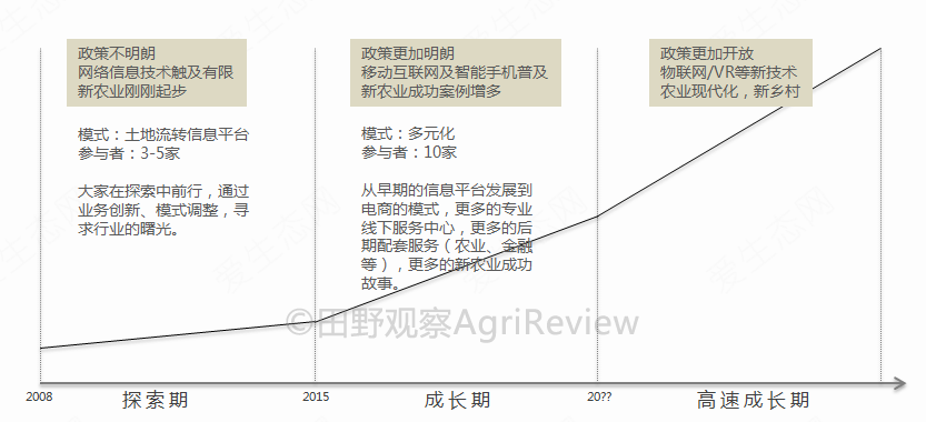 土地流转电商大体可以分为三个时期:探索期,成长期和高速成长期。