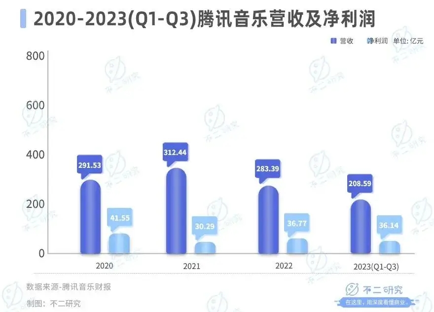 「不二研究」据腾讯音乐三季报发现:2023年前三季度,腾讯音乐营收为208.59亿元,同比减少0.26%;同期,净利润为12.6亿元,同比增加15.6%。