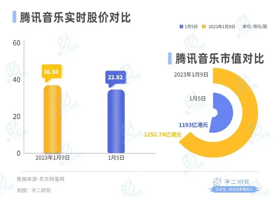 2023年首个交易日,腾讯音乐在资本市场迎来“开门红”。截至1月5日收盘,腾讯音乐报收34.7港元/股,对应市值1193亿港元(约折合人民币1094.18亿元),对比2023年1月市值高点1252.74亿港元,其市值已经蒸发59.74亿港元。
