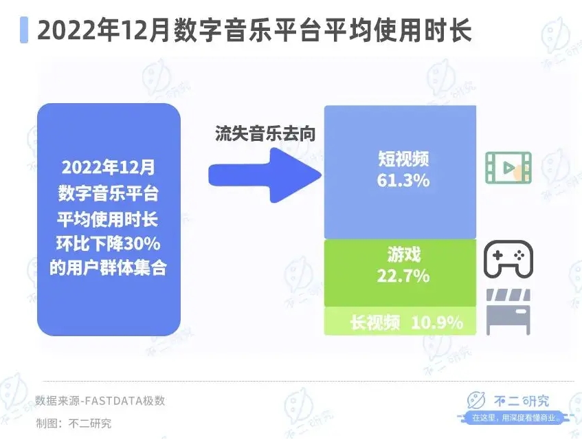Fastdata极数发布的《2022年中国在线音乐行业报告》显示,2022年12月,数字音乐平台平均使用时长环比下降30%的用户群体,同一时间段内使用抖快短视频平台的时长环比增幅达61.3%。短视频对用户碎片时间的侵吞可见一斑。
