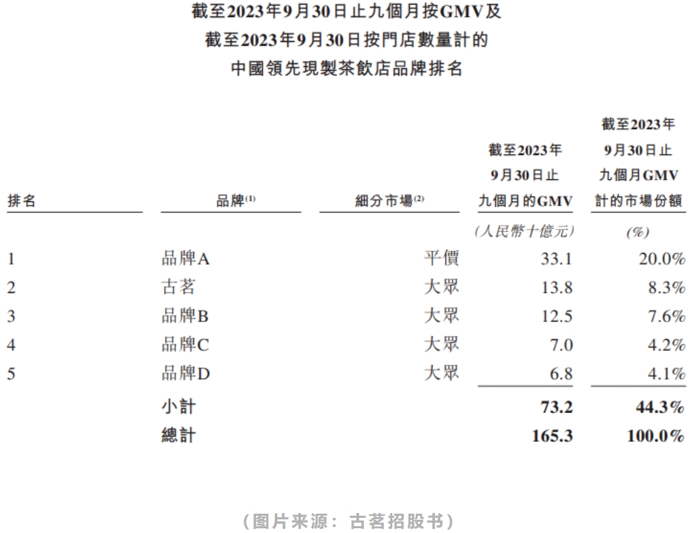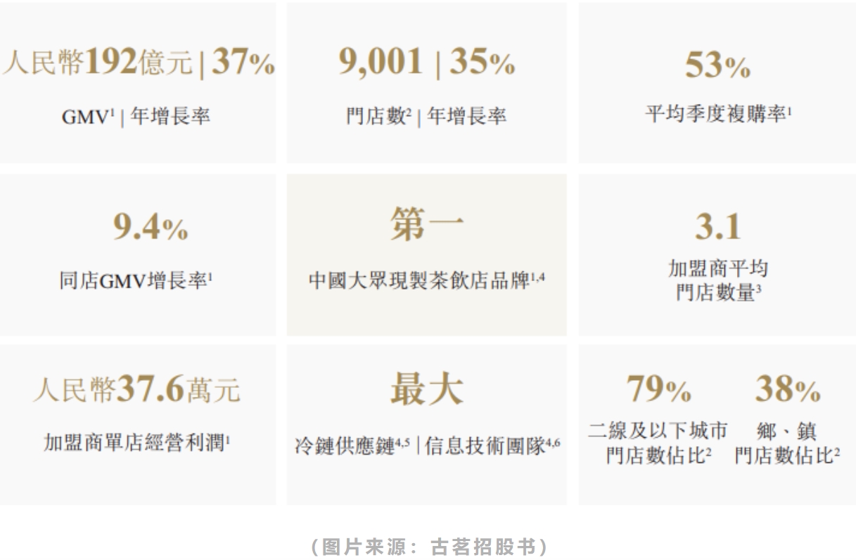 然而打开招股书你会惊讶地发现,原来古茗是一家拥有9001门店,商品销售额(GMV)192亿元的品牌。此外,古茗还号称是中国最大的大众现制茶饮品牌,以及全价格带下中国第二大现制茶饮店品牌。