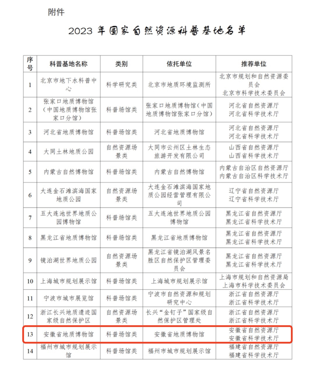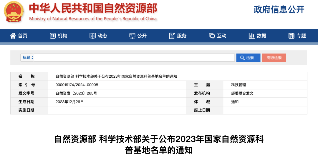 近日,自然资源部官网发布了《自然资源部 科学技术部关于公布2023年国家自然资源科普基地名单的通知》,其中,安徽省地质博物馆入选。