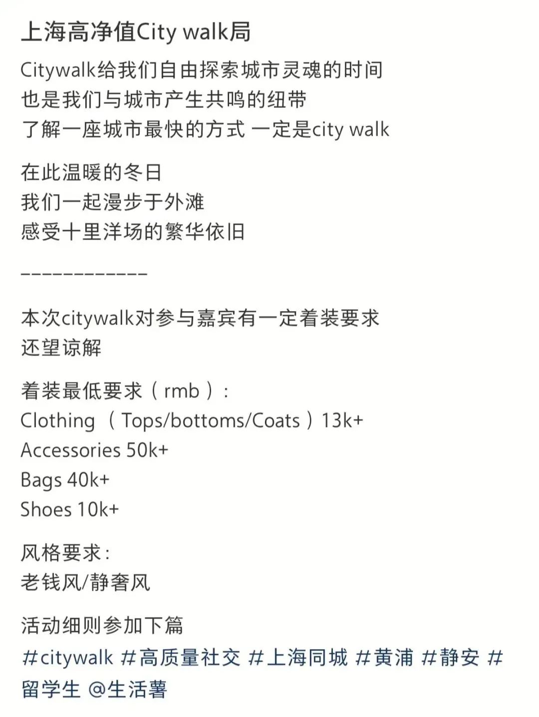 就在2023年最后一个月,小红书某博主发起了“上海高净值 Citywalk 局”,除了每人5200的活动经费,还得是“老钱风”穿搭才配入场:1万3起的衣服、5万元起的配件、4万元起的包、1万元起的鞋。
