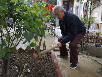 元月6日,星期五,这是一个普通的周末,但对于79岁的徐善根来说是“忙碌”的一天。早晨室外的温度在摄氏9度左右,蒙蒙细雨让人感到一丝冬天的寒意,上午八点他就急忙到阳台上将红运果树、石蜡红、丁香木等几盆花放进屋子里保暖。他养的这些花木并不是只为自己家欣赏的,而是今年春天要移栽进社区的“党员爱心责任田”的。下雨也是松土的好时机,老徐便拿上锄头到为楼下的小花园松土。