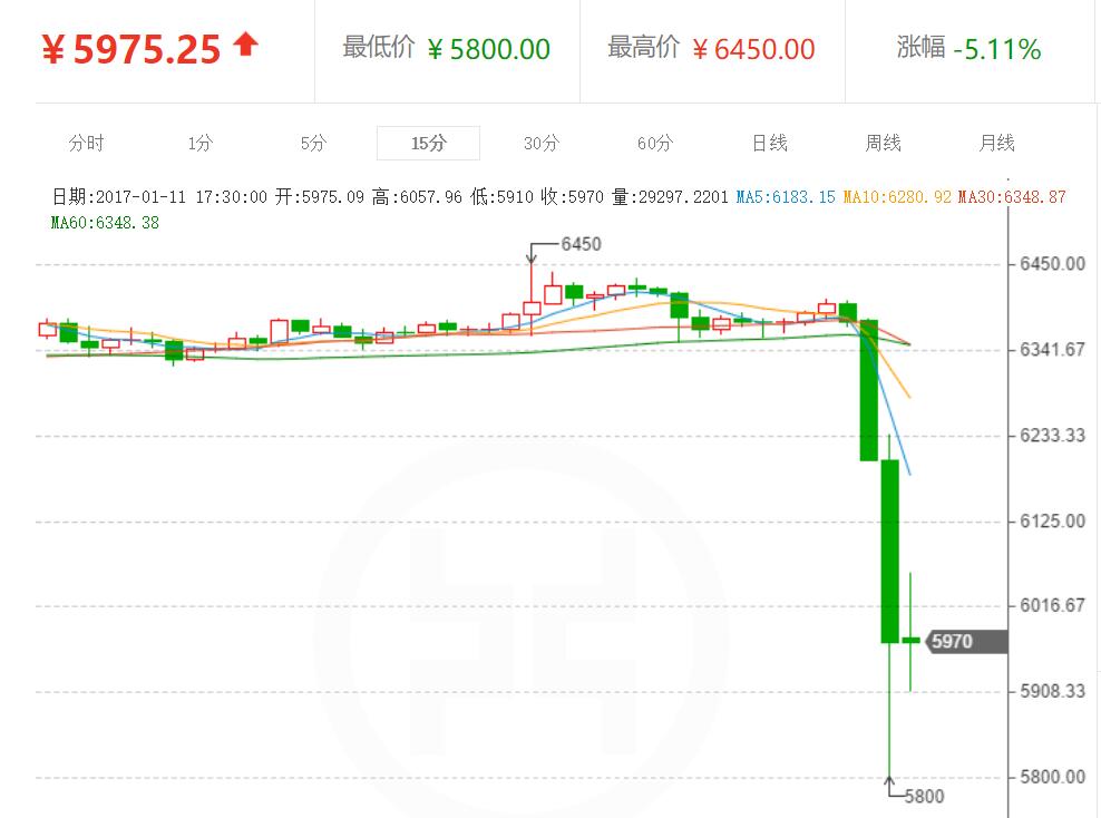监管风暴来袭 比特币短线急跌破6000元