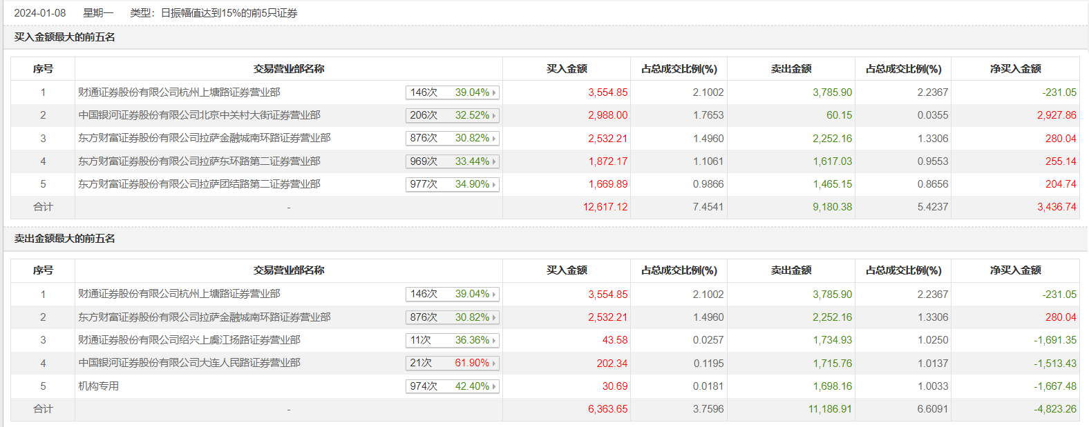日久光电1月8日跌停,全天换手率43.35%,成交额16.93亿元,振幅16.17%。龙虎榜数据显示,机构净卖出1667.48万元,营业部席位合计净买入231.96万元。深交所公开信息显示,当日该股因日振幅值达16.17%、日换手率达43.35%、日跌幅偏离值达-8.12%上榜,机构专用席位净卖出1667.48万元。上榜的前五大买卖营业部合计成交2.72亿元,其中,买入成交额为1.29亿元,卖出成交额为1.43亿元,合计净卖出1435.51万元。