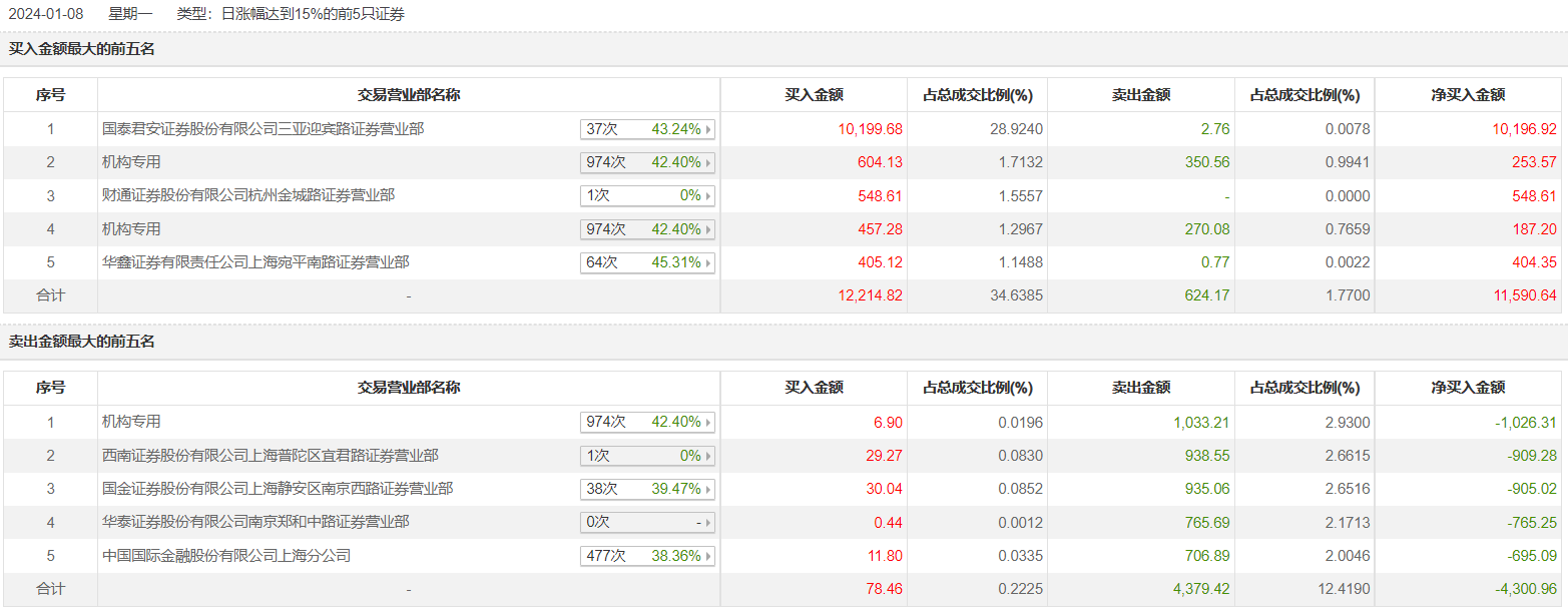 GQY视讯1月8日涨停,全天换手率14.00%,成交额3.53亿元,振幅21.67%。龙虎榜数据显示,机构净卖出585.55万元,营业部席位合计净买入7875.23万元。深交所公开信息显示,当日该股因日收盘价涨幅达20.00%上榜,机构专用席位净卖出585.55万元。上榜的前五大买卖营业部合计成交1.73亿元,其中,买入成交额为1.23亿元,卖出成交额为5003.59万元,合计净买入7289.69万元。
