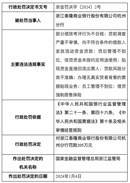 1月9日,国家金融监督管理总局浙江监管局行政处罚信息公开表显示,2024年1月4日,浙江泰隆商业银行股份有限公司杭州分行被处罚款205万元。主要违法违规事实为:部分绩效考评行为不合规;贷前调查严重不审慎,向不符合条件的借款人发放流动资金贷款;贷后管理不到位,信贷资金未按约定用途使用;贴现资金直接回流出票人;贷款风险分类不准确;办理无真实贸易背景的票据贴现业务;员工管理不到位;借贷强制搭售保险。