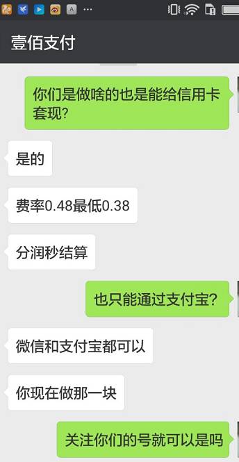 从支付宝工作人员的回复来看,目前九付钱包和支付宝二者间的具体关系还不明确,还需要支付宝给出更明确的回复,但可以确定的是,九付钱包利用支付宝套现的情况并不是个例,下图为另一第三方企业——壹佰支付的工作人员向野马财经推销其套现产品的聊天截图: