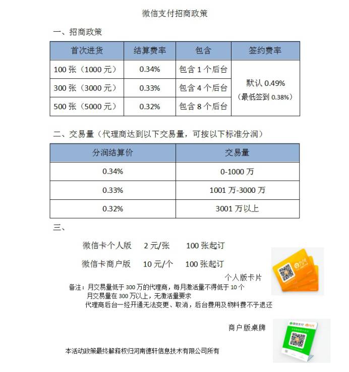九付钱包的客服对野马财经表示,加盟费最低只需1000元,加盟费中有500元是物料的费用,这500元的物料费可以换来250张个人卡片(名额)或者50个商户卡片(名额),无论商户还是个人只需扫码就可以完成绑定(注:绑定后即可进行信用卡套现),不需任何审核,下图为九付钱包招商政策: