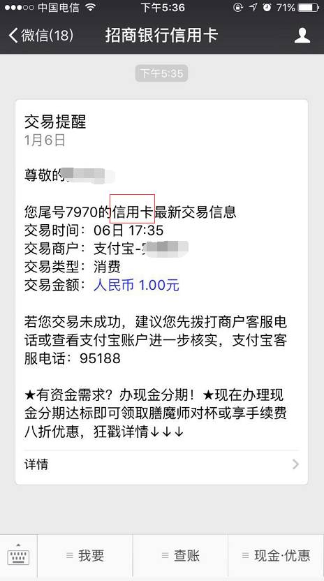 通过九付钱包,野马财经轻松就将身份从个人变成了“商户”,只需简单的扫码就可以收取自身及第三方的信用卡的资金,而显示的信用卡资金的用途是消费而不是提现,下图为野马财经“自我付款”成功后的交易提醒: