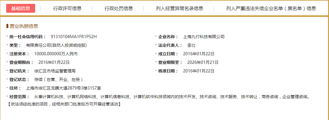 根据国家企业信用信息公示系统显示,上海九付科技有限公司成立于2016年1月22日,注册资本为1亿元人民币,其经营范围是计算机科技、计算机网络科技、计算机信息科技、计算机软件科技领域内的技术开发、技术咨询、技术服务、技术转让,商务咨询,企业管理咨询,并不包括网络支付服务。