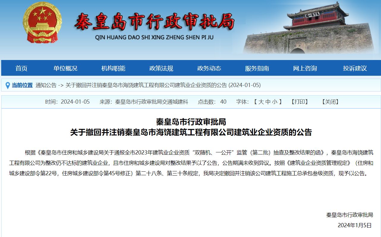 秦皇岛市海饶建筑工程有限公司为整改仍不达标的建筑业企业,秦皇岛市行政审批局决定撤回并注销秦皇岛市海饶建筑工程有限公司建筑业企业资质