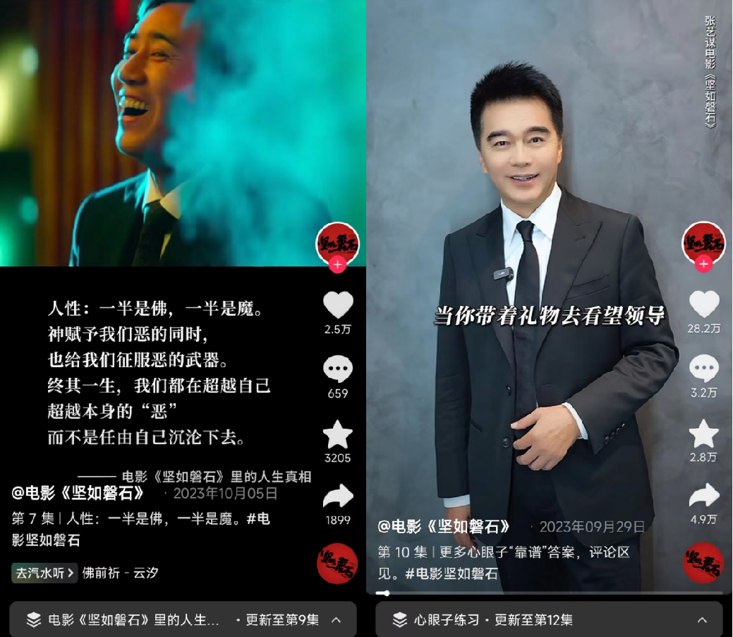 其中,10月份票房冠军《坚若磐石》抖音官方账号上的两个分类栏目,一个是“人生真相”,带上电影剧照,进行鸡汤金句输出;另一个是“心眼子练习”,让出演演员念题目,对观众人情世故进行考察,一共做了12期。