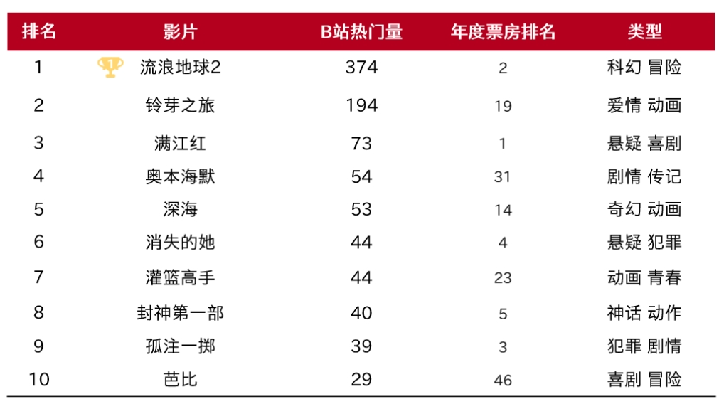 如《奥本海默》在B站热度排名第四。同时也需要关注到,B站仍旧是动漫题材的电影最好的宣传阵地。《铃芽之旅》排行第二,仅次于《流浪地球2》。《灌篮高手》排名第七。