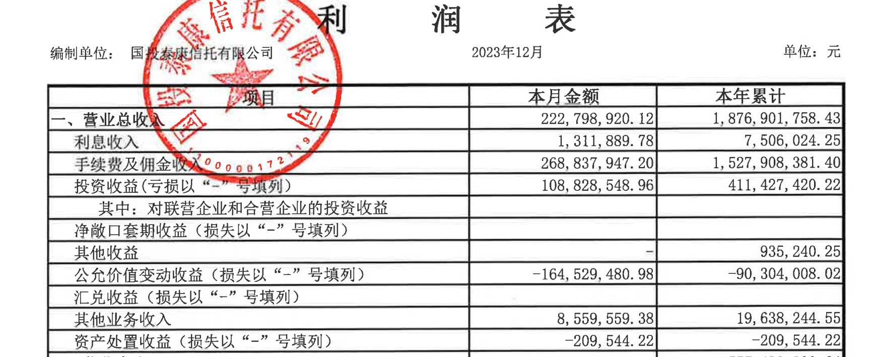 1月9日盘后,国投资本(600061.SH)披露了旗下子公司国投泰康信托有限公司(下称:国投泰康信托)2023年度未经审计财务报表。