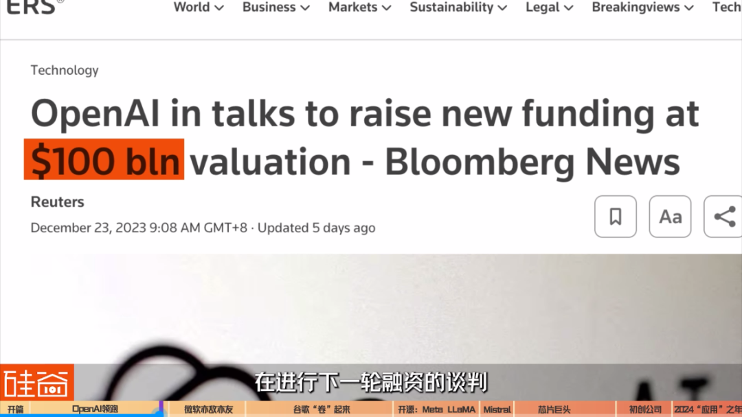 就在2023年圣诞节的前几天新闻爆出:OpenAI正在用1000亿美元的估值在进行下一轮融资的谈判。如果达到这一估值,OpenAI将成为仅次于SpaceX的第二大估值的美国初创独角兽公司。