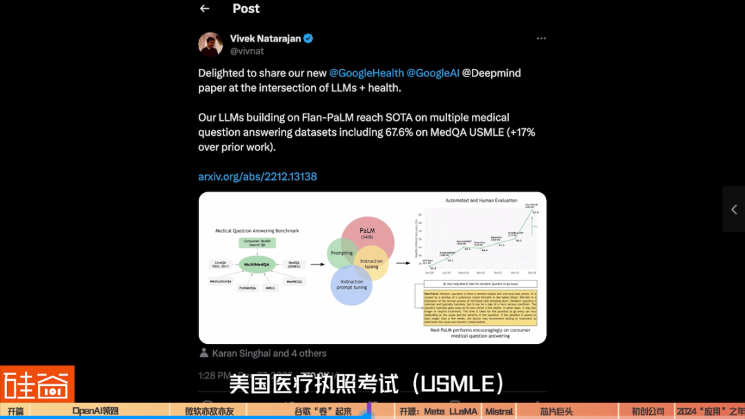 同时,在2023年12月13日谷歌在医疗人工智能大模型上持续发力,推出MedLM。这个模型基于Med-PaLM 2。在2022年,谷歌Med-PaLM模型因为通过了美国医疗执照考试(USMLE)而成为头条新闻,当时的准确率为67%,而今年,Med-PaLM 2进一步将准确率大幅提升至86.5%,根据谷歌的说法,这个分数相当于“专家”医生水平。