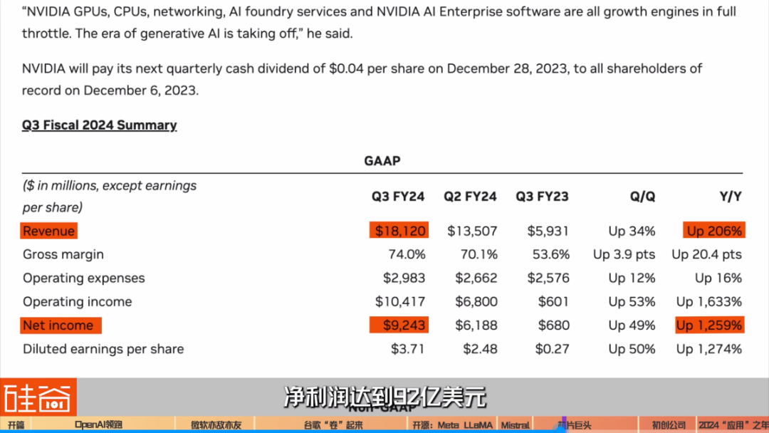 根据英伟达发布的财报,截至今年10月底的一个财报季,英伟达收入达到181亿美元,同比翻番,净利润达到92亿美元,是去年同时期的13倍。