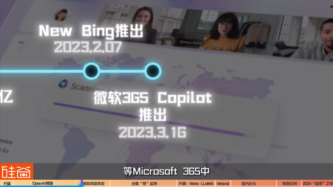 2023年2月7日微软推出集成了GPT的bing chat,或者叫new bing。2023年3月16日,微软发布了 Microsoft 365 Copilot,将 GPT-4 集成在了 Word、Excel、PowerPoint、Outlook、Teams 等 Microsoft 365 中。