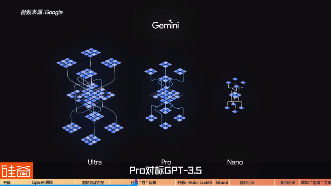 2023年12月6日,外界期待已久的谷歌多模态大模型Gemini (双子座)终于发布,包含三个版本:Nano、Pro和Ultra,Pro对标GPT-3.5,Ultra对标OpenAI在今年3月发布的GPT-4,被谷歌CEO Sundar Pichai称为“谷歌迄今为止能力最强的AI模型”,可以处理文本之外的信息,包括图像、视频和音频。从谷歌发布的演示视频中能看出,Gemini结合了视觉和听觉,充分展示出多模态模型的巨大应用潜力。