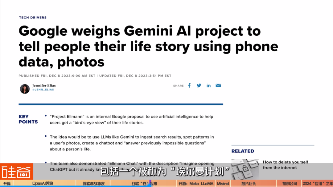 目前谷歌内部已经有多条产品线开始和Gemini融合,或者基于Gemini开始衍生出各种应用的想象,包括一个被称为“埃尔曼计划”(Project Ellmann)的项目,让AI大模型读取用户的照片、搜索历史和生活记忆等数据,创建一个能有birdview“鸟瞰”人们一生数据、全面了解你懂你的AI生活助手。埃尔曼计划团队演示的时候就描述说:“想象一下打开ChatGPT,但它已经知道你生活的一切。你会问它什么?”