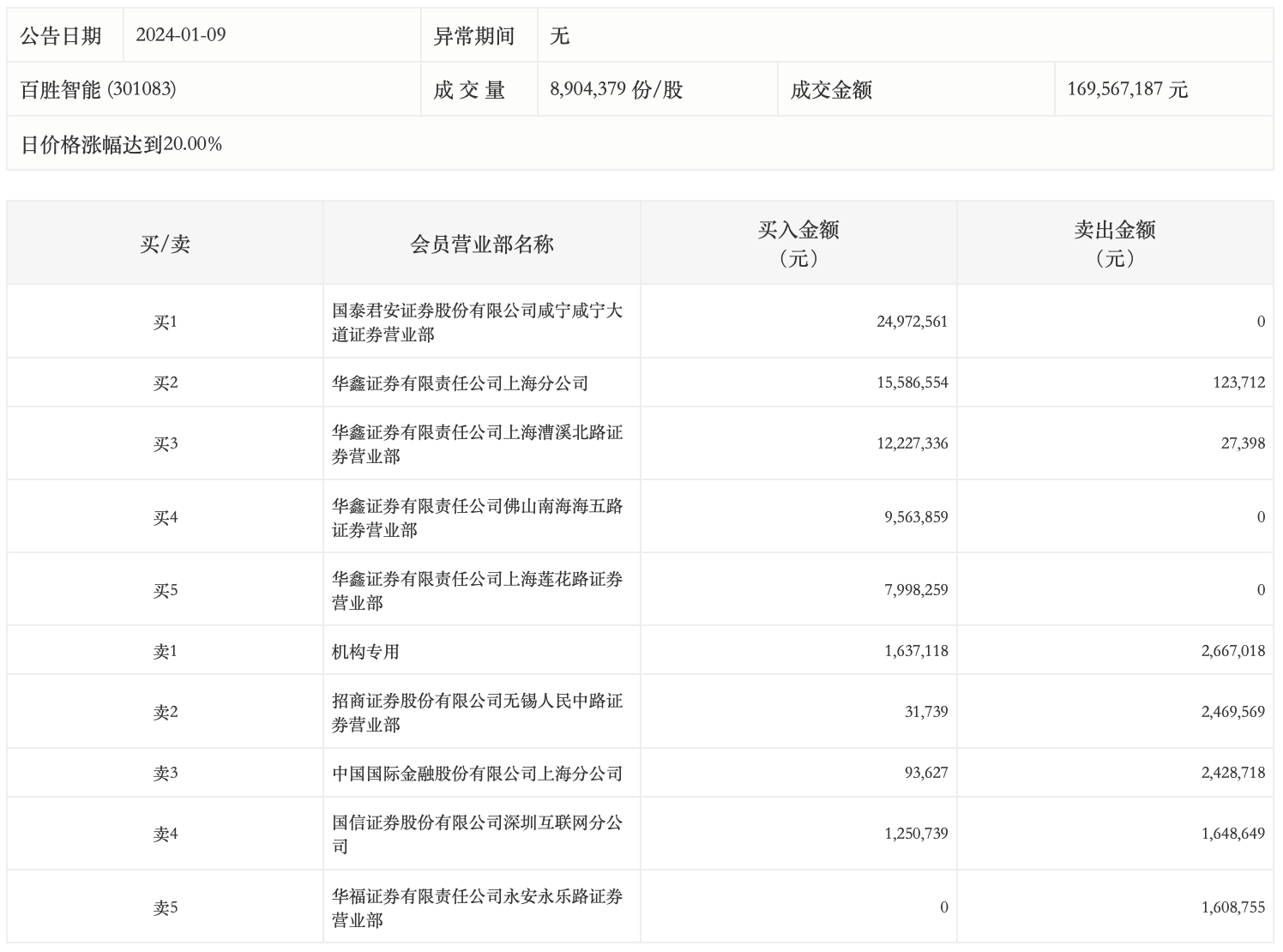 1月9日,百胜智能今日涨停,全天换手率达16.23%,振幅达19.74%。龙虎榜数据显示,营业部席位合计净买入6238.8万元。其中,机构买入163.71万元,卖出266.7万元,合计净卖出102.99万元。此外,国泰君安证券咸宁咸宁大道证券营业部、华鑫证券上海分公司分别买入2497.26万元、1558.66万元;招商证券无锡人民中路证券营业部、中国国际金融上海分公司分别卖出246.96万元、242.87万元。