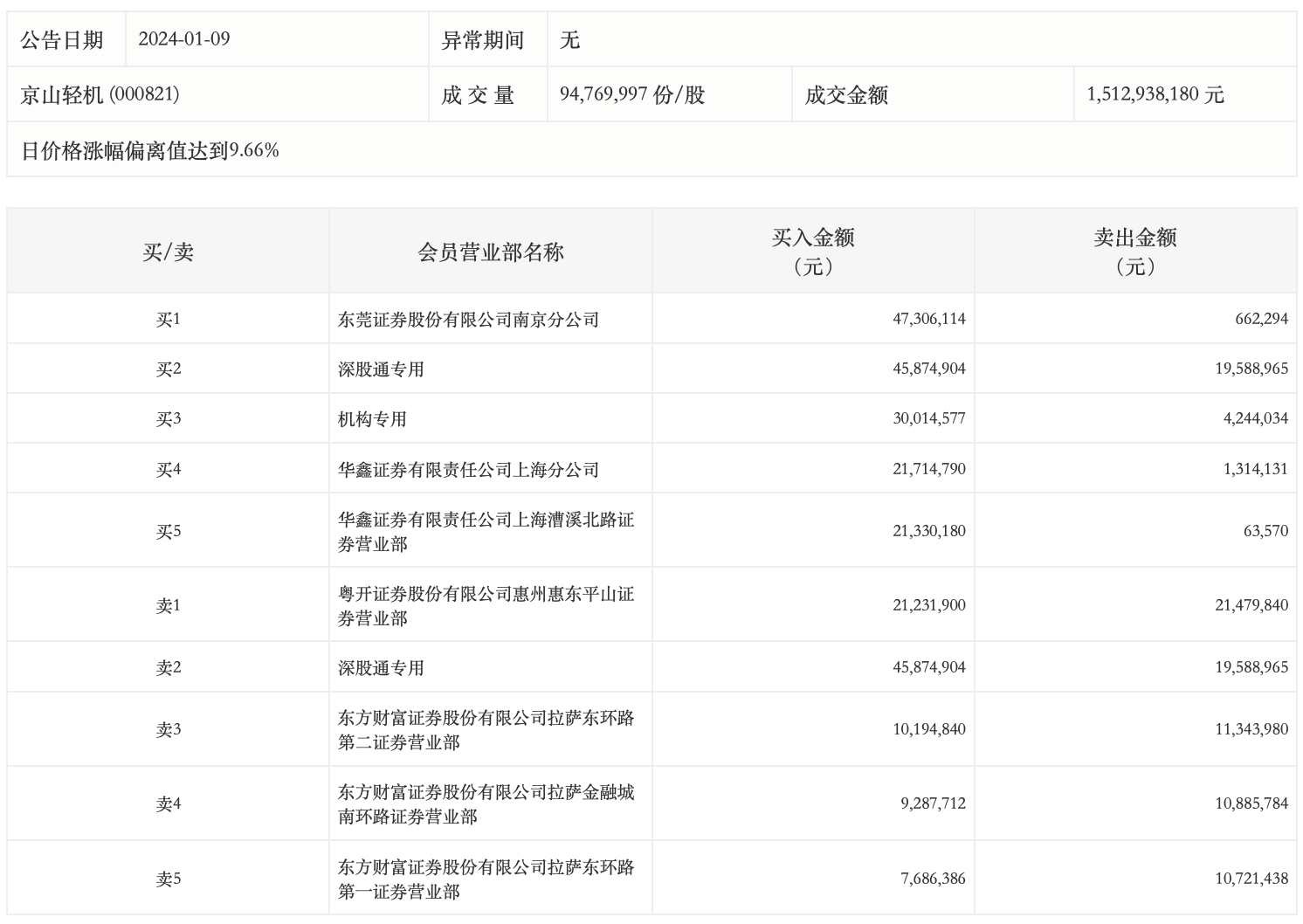 1月9日,京山轻机今日涨停,全天换手率达16.33%,振幅达12.01%。龙虎榜数据显示,营业部席位合计净买入1.34亿元。其中,机构买入3001.46万元,卖出424.4万元,合计净买入2577.05万元。此外,东莞证券南京分公司、深股通专用分别买入4730.61万元、4587.49万元;粤开证券惠州惠东平山证券营业部、深股通专用分别卖出2147.98万元、1958.90万元。
