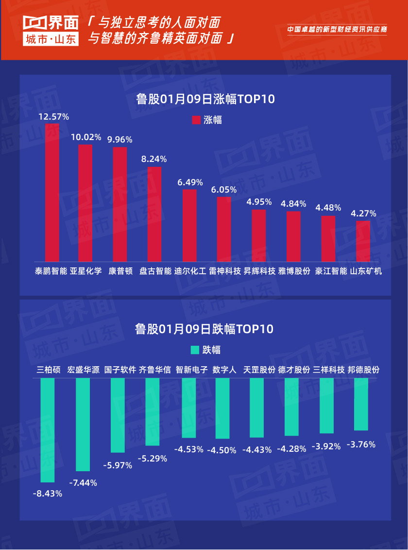 1月9日,山东沪深京板块共有203只个股上涨,6股持平,98只下跌。