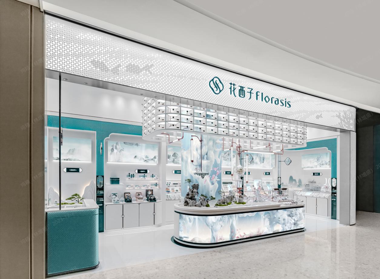 花西子门店位于全球美妆广场一层中庭,装潢设计上以“海底园林”为主题,产品选择上不仅有线上的一些大单品,也会有专属于线下渠道的产品。