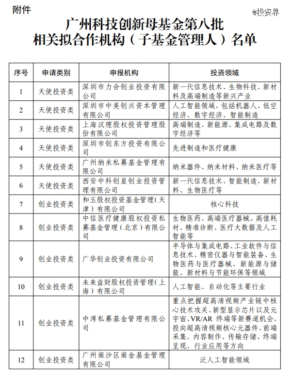 投资界-解码LP获悉,广州市科学技术局发布《广州科技创新母基金第八批相关拟合作机构(子基金管理人)名单公开》,拟定12家机构为广州科技创新母基金第八批拟合作机构(子基金管理人)。