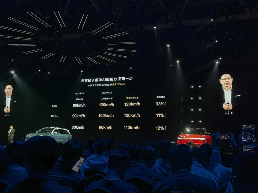 华为问界M9发布会上,余承东展示的一组数据显示,问界M9对静止车辆或行人的自动紧急刹停,在9月就能做到90公里/小时,到12月进一步提升到了120公里/小时。这意味着问界M9在最高时速120公里时识别到障碍物能做出迅速的刹停反应,这也能有效地缓解王传福的模拟车祸现场的工作量担忧。