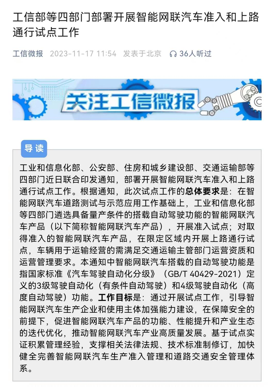 2023年11月17日,工信部、公安部、住建部和交通部联合发文,“决定开展智能网联汽车准入和上路通行试点工作。”