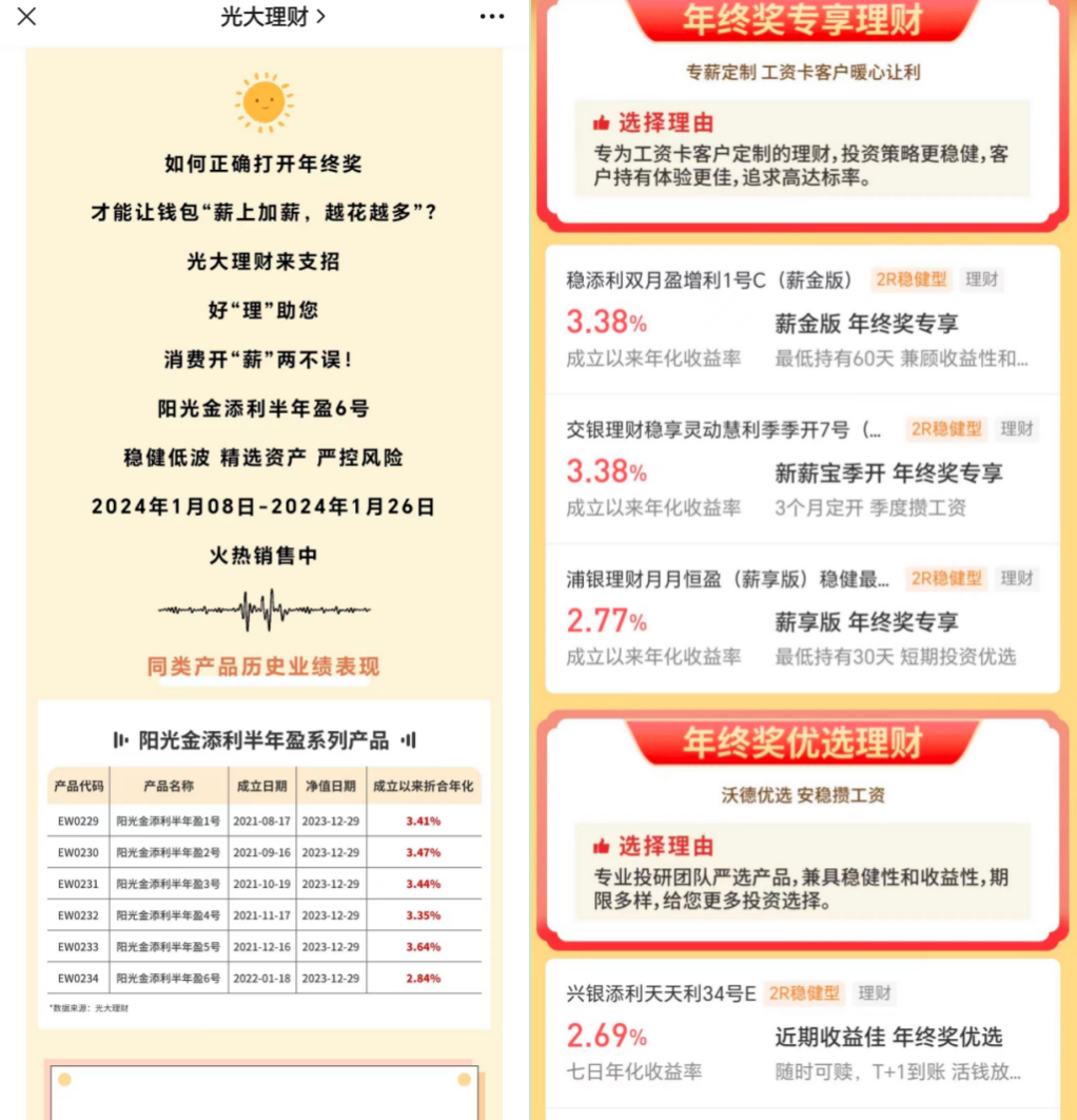 1月9日,光大理财官方公众号推荐年终奖理财产品“阳光金添利半年盈6号”,根据中国理财网和wind信息,该产品为固收类理财产品,产品主要投资于债券、精选项目资产等固定收益类资产,成立以来年化收益率2.84%,产品的业绩比较基准为3.45%。
