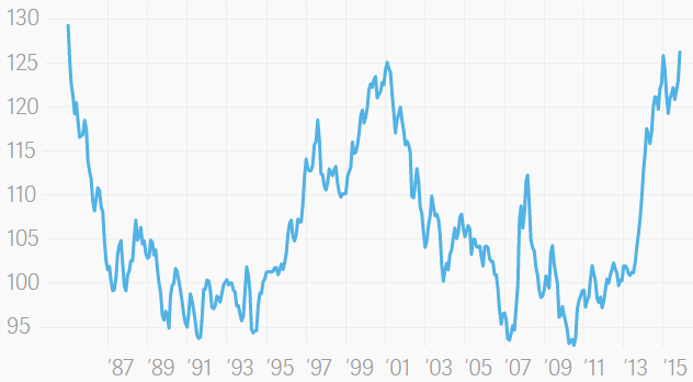 与过往相同,美元大幅走强很容易引起担忧。一些经济学家警告称,当前美元升值势头将伤害到美国制造业,同时会促使资本撤出新兴市场。自2014年年中以来,美元兑主要贸易伙伴国货币累计升值大约25%。