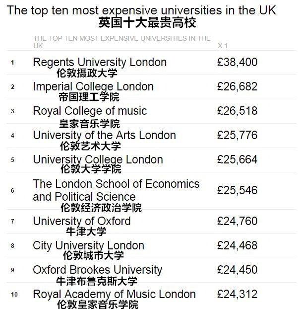 伦敦摄政大学排到了首位,在这里念书,你得每年准备近4万英镑,折合人民币32.1万元。校区的地理位置极佳,就坐落在伦敦最著名的皇家公园——摄政公园内。每年12948英镑(约10.8万人民币)的住宿费倒是很符合中心地段的要价,比英国北安普顿大学(最划算的大学校舍)住宿费高出72%。