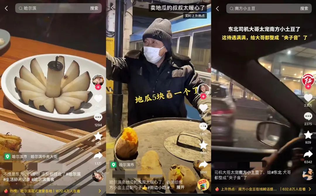 从饭店的冻梨刺身,到街边烤红薯提供勺子,出租车司机用“夹子音”跟游客对话,市民自发组成爱心顺风车队免费拉游客,这些互动让东北的风土人情有了更立体的呈现。而当越来越多的南方人进入东北空间,南北方之间的文化差异性,又为话题增添了新的内容。