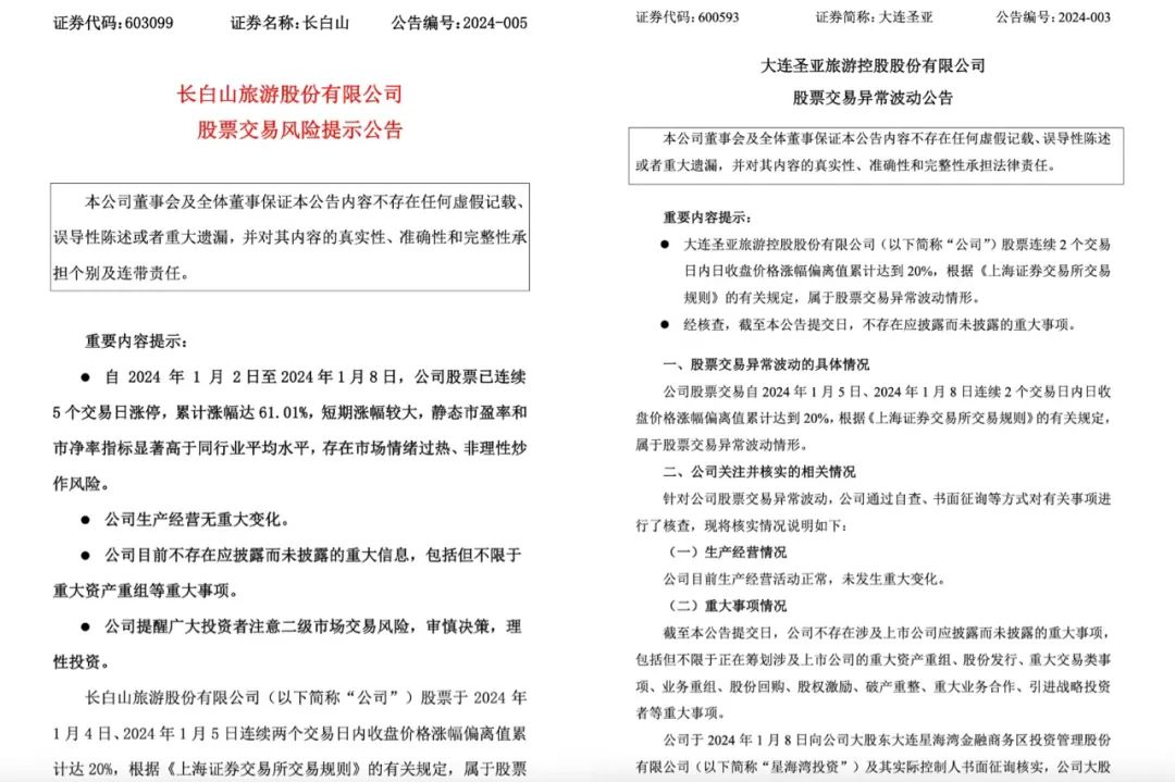 线下旅游热度也带动了东北旅游板块上市公司股价飞涨。大连圣亚和长白山继续涨停,两家公司接连发布公告提示股票异常波动风险,不存在应披露而未披露的重大事项。