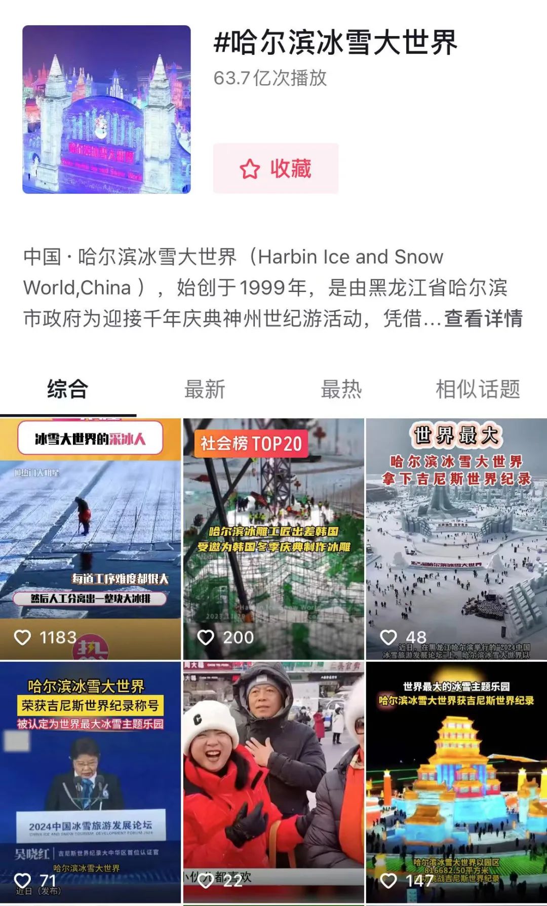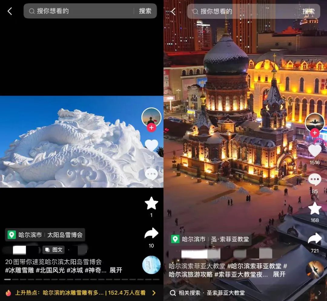12 月,哈尔滨的特色景点冰雪大世界进入密集宣传期,在一些短视频宣传中,强调其“冰建区61万平方米,是有史以来规模最大,场面最壮观的一次”。作为冬日最火爆的旅游景点,“哈尔滨冰雪大世界”词条在抖音累计播放数达63.7亿。