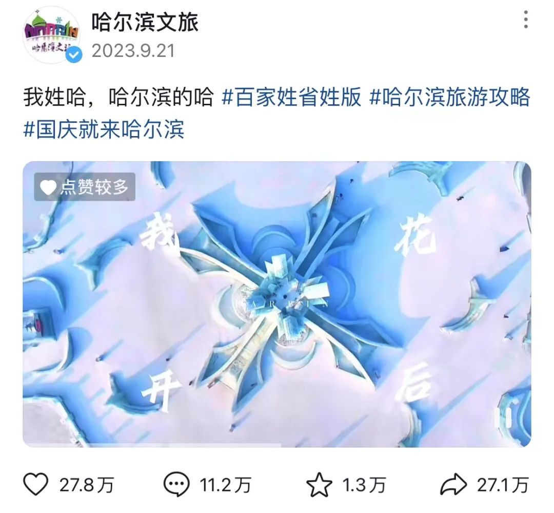 哈尔滨文旅官方账号发布视频《我姓哈》,用土味喊麦的形式,为哈尔滨即将到来的冰雪季进行预热宣传。点赞27.8万,评论11.2万,该视频是哈尔滨文旅官方账号数据最高的一支视频。