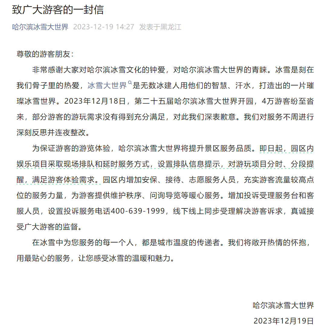 随后,哈尔滨文旅迅速反应。冰雪大世界及时安排退票,一天之内冰雪大世界发布《致广大游客的一封信》,宣布立即开展整改举措,同时,哈尔滨文旅局领导赶赴现场督导,公开道歉,随后取消预约制。