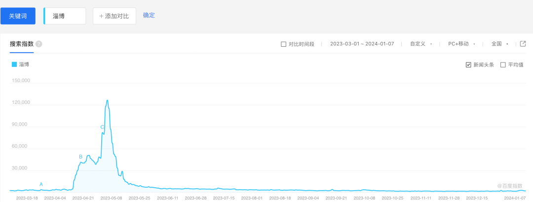 根据百度指数显示,2023年4月至5月,“淄博”关键词迅速飙升,最高值达到了126380,之后,搜索指数快速回落,恢复到之前搜索指数值,不到高峰期的百分之一。