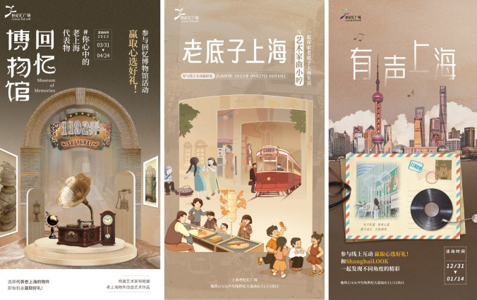 作为输出文化艺术内容的又一创新尝试,世纪汇广场在2023年3月底全新推出线上“品牌互动专区”,构建以社交、共创为基因的OMO互动平台,以期打造一张世纪汇广场长期有效的动态名片。通过这一平台,17位先锋艺术家先后在此激荡灵感,与世纪汇共同呈现3档不同形式的社交媒体互动传播。从“回忆博物馆”到“老底子上海”,再到12月上线的“有声上海”,围绕“城市精神”主题,世纪汇展现上海独有文化的同时,也为受众构建了一个在线文化交流体验的新平台。