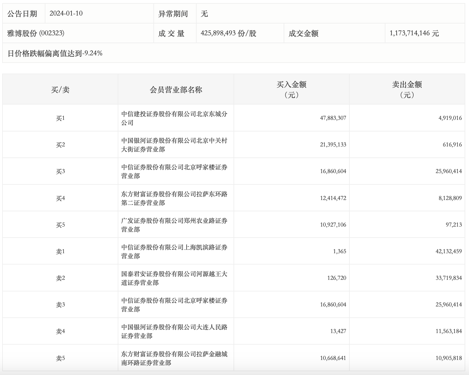 1月10日,雅博股份今日跌停,全天换手率达20.08%,振幅达4.95%。龙虎榜数据显示,营业部席位合计净卖出1775.29万元。其中,中信证券上海凯滨路证券营业部、国泰君安证券河源越王大道证券营业部分别卖出4213.25万元、3371.98万元;中信建投证券北京东城分公司、中国银河证券北京中关村大街证券营业部分别买入4788.33万元、2139.51万元。
