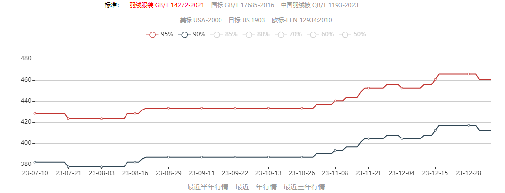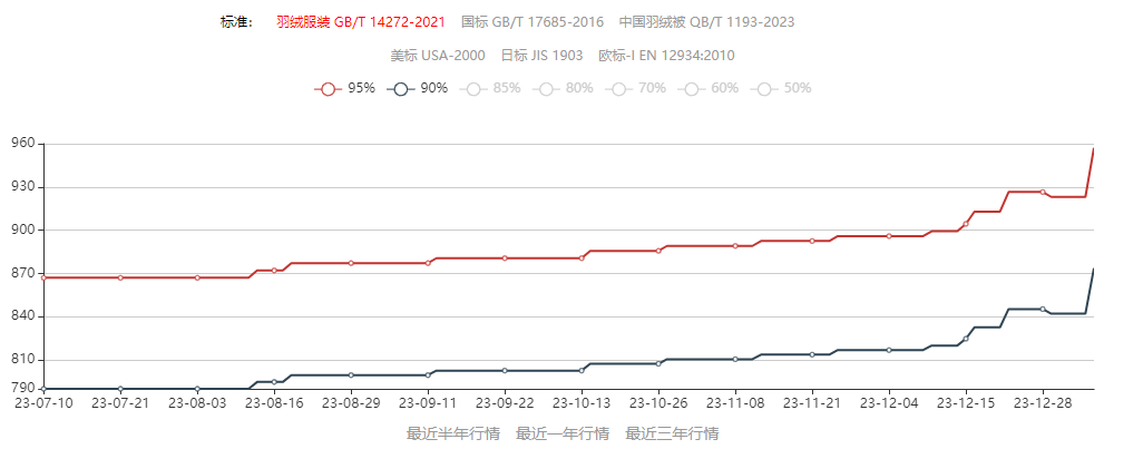 无论鸭绒还是鹅绒,价格都在一路走高。据羽绒金网的GB/T 14272-2021标准羽绒价格显示,95鹅绒和90鹅绒价格分别从2023年7月的867元/kg和790元/kg,一路分别飙涨至今年年初的957.1/kg元和873.74元/kg。