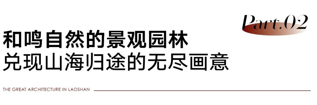 因地制宜,以景造境,是崂山壹號院造园的基本出发点。依循坡地高低起伏,从自然与人文角度出发,引山海入园,建立起一种更契合、更诗意永续的地缘关系,创造一处人与风景连接的纽带,讲述山海归途的场景之诗,让人置身其中,俯仰皆画意,仿若从自然中蔚然生长。