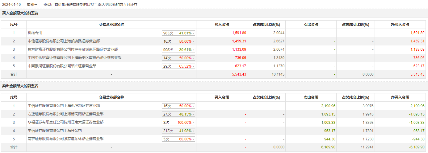 具体来看,机构合计净买入1591.8万元。此外,知名游资现身龙虎榜,赵老哥(中国银河证券股份有限公司绍兴证券营业部)净买入623.17万元。此外,中信证券上海凯滨路证券营业部、方正证券上海杨高南路证券营业部分别卖出2190.96万元、1093.15万元;中信证券上海凯滨路证券营业部、东方财富证券拉萨金融城南环路证券营业部分别买入1459.31万元、1133.09万元。