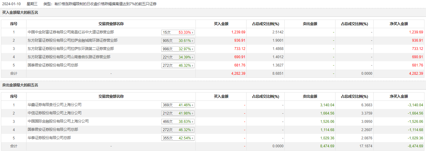 欧亚集团1月10日跌停,全天换手率达21.93%,振幅达8.11%。龙虎榜数据显示,营业部席位合计净卖出4192.3万元。其中,华鑫证券上海分公司、中信证券上海分公司分别卖出3140.04万元、1664.56万元;中国中金财富证券有限公司南昌红谷中大道证券营业部、东方财富证券拉萨金融城南环路证券营业部分别买入1239.69万元、936.91万元。